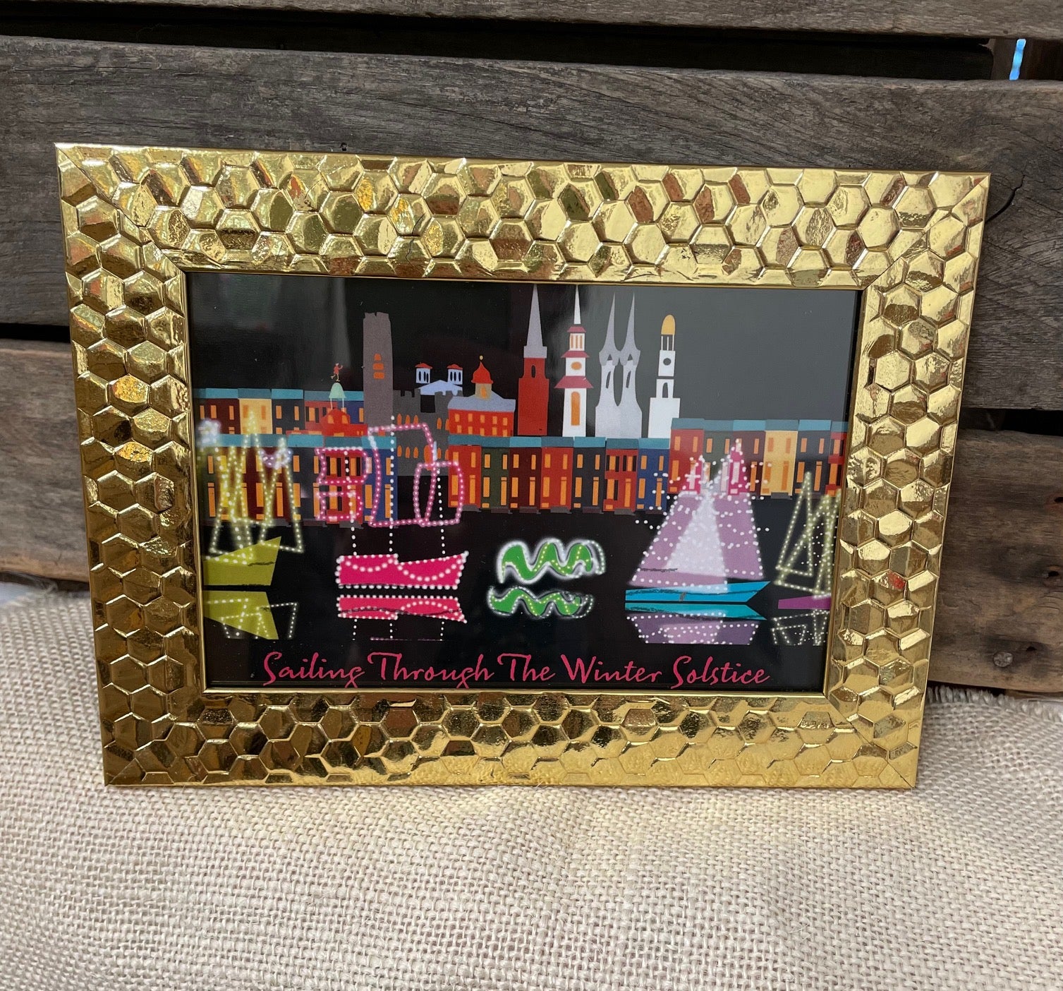This framed art print from local artist Ellen Byrne features Frederick's iconic Sailing Through the Winter Solstice public art display. Art measures 5.5" by 7.5" including frame.