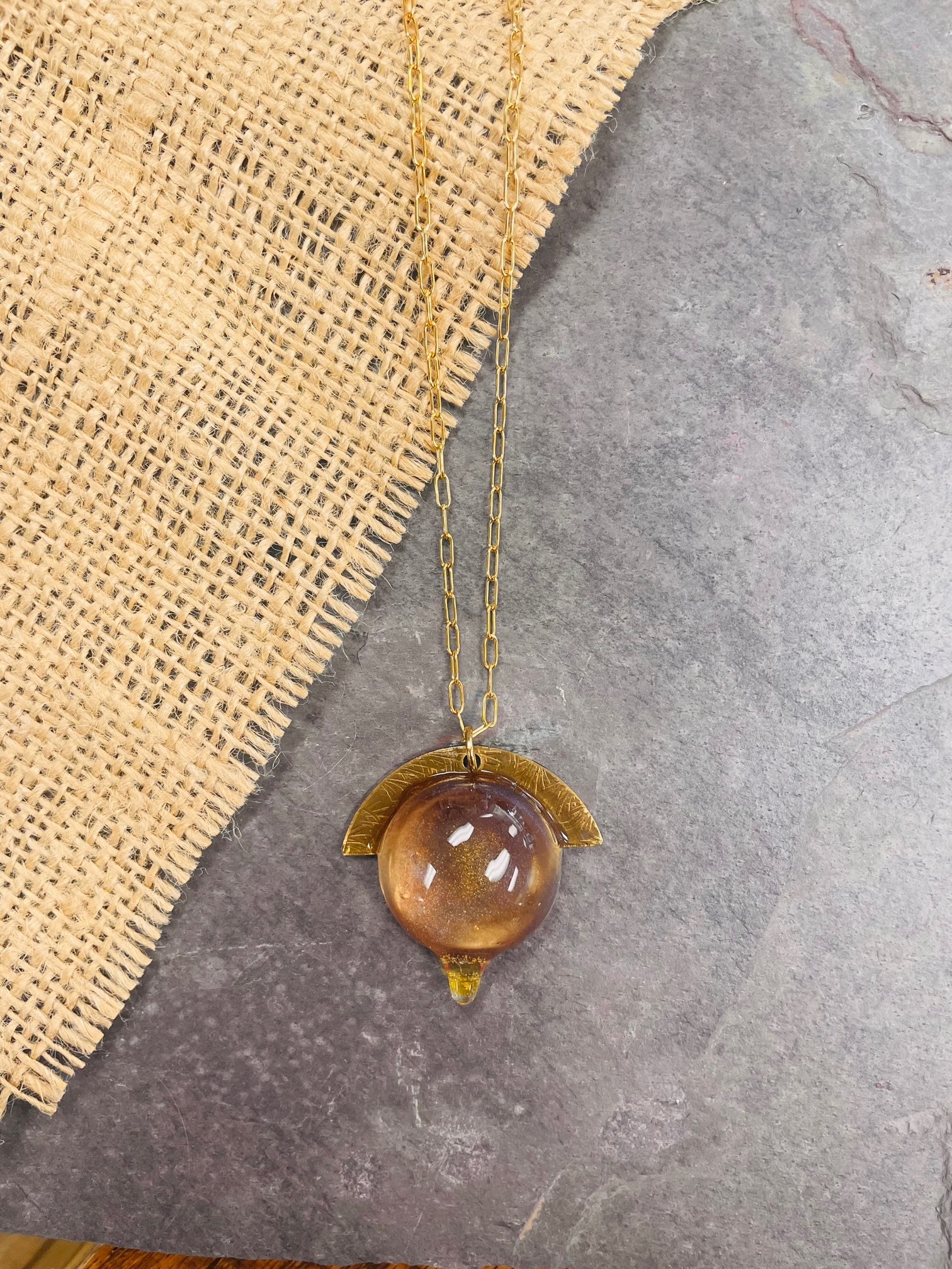 This pendant necklace from Maryland artist Kit Aikin is made of resin and stamped brass metal, with a brass chain. Chain measures 23".